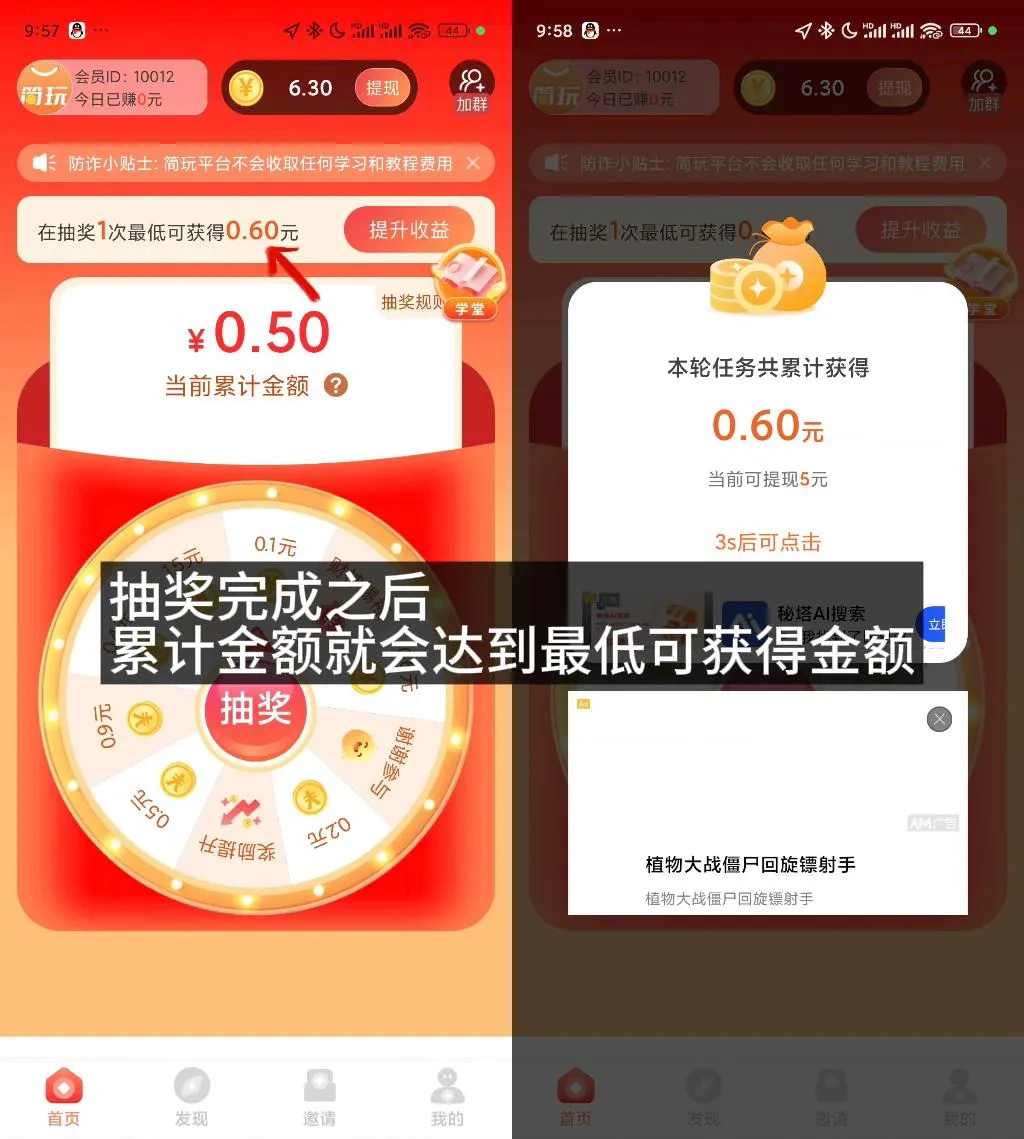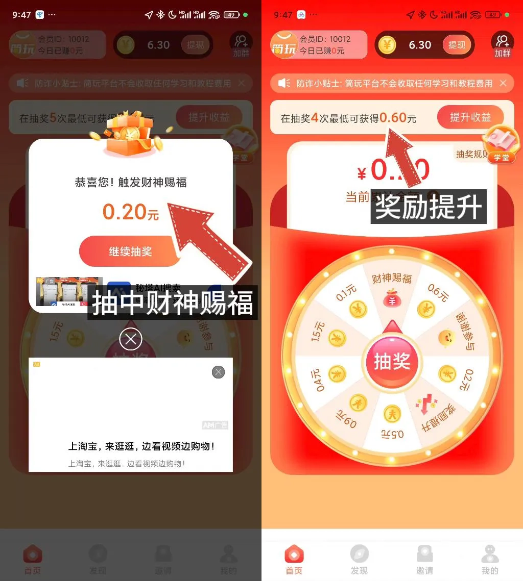 看了提升收益的广告后,可能会抽到财神赐福,那么当前这轮抽奖的最低奖励就会提升。建议大家在抽奖过程中多看看提升收益的广告