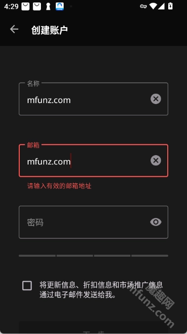 3.然后输入名称、邮箱以及密码,点击下一步,最后根据提示完成注册即可。