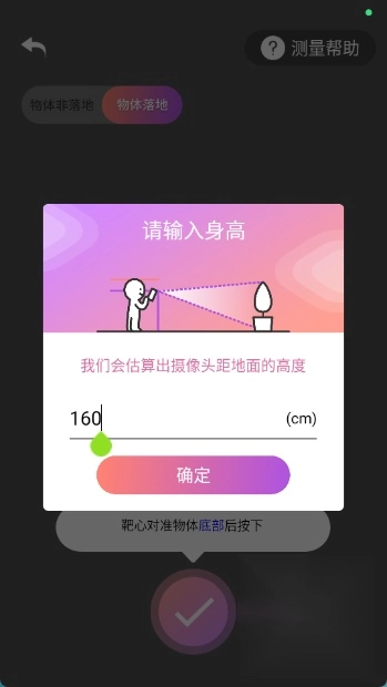 3.确定后测量中身体站直,不要移动手机放在胸前固定不动,首先靶心对准物体底部,然后点击,再靶心对准物体顶部,再次点击