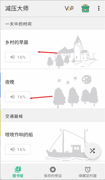 减压大师里面有很多种自然的声音,让你轻松沉浸于大自然的环境中,包括了早晨、夜晚、火车、篝火燃烧、溪流、海浪、风吹、鸟鸣等十几种大自然的声音元素。倾听这些音频,让整个人安静下来,静静入睡,把你的睡眠质量提高改善。