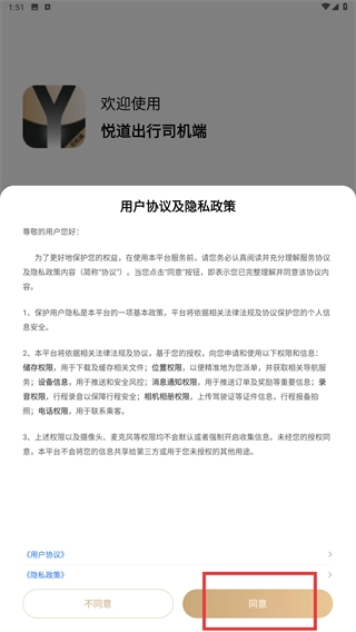1、在用户协议及隐私政策弹窗,点击【同意-功能按钮】,确认相关协议内容。