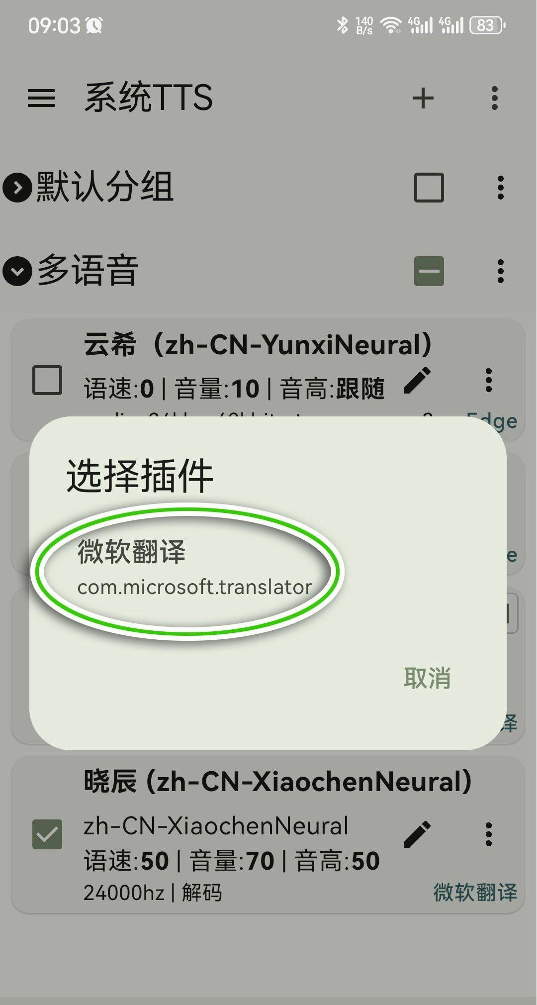 4、(推荐)添加插件TTS→选择插件→选择微软翻译:调用微软翻译服务器来合成语音,仍然有效。