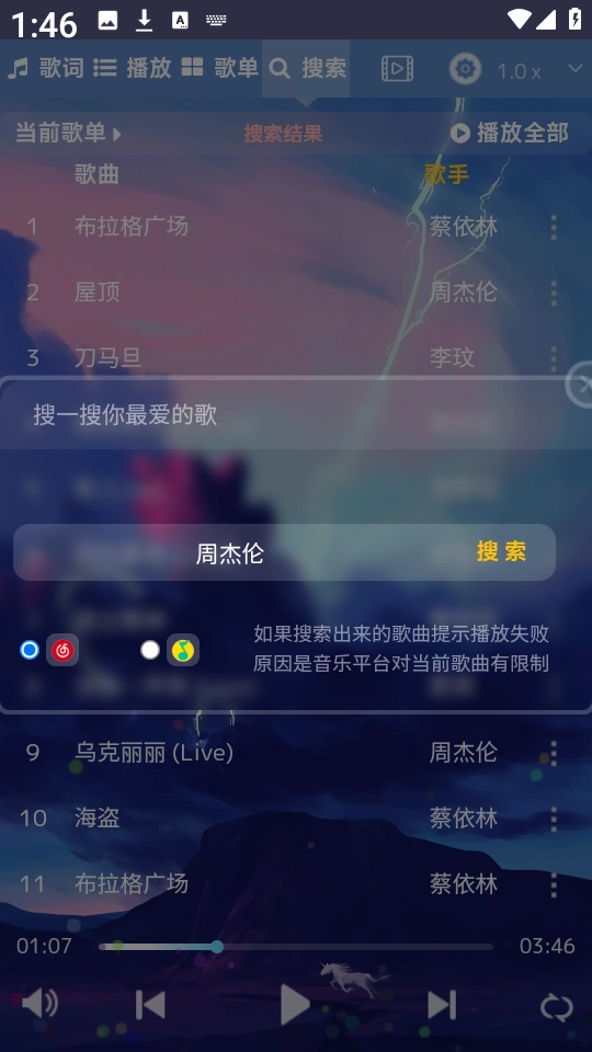 3. 在搜索框中输入想听的歌手名字或歌曲名字,开始搜索。