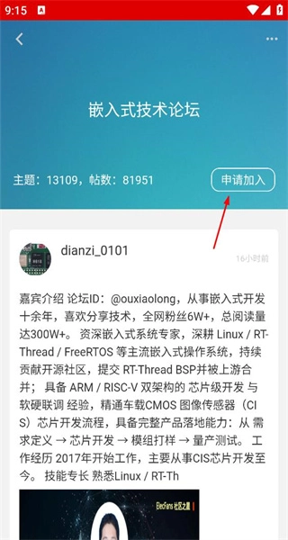 4、再选择嵌入式技术论坛,进入详情页,点击申请加入按钮,完成该板块的加入申请。