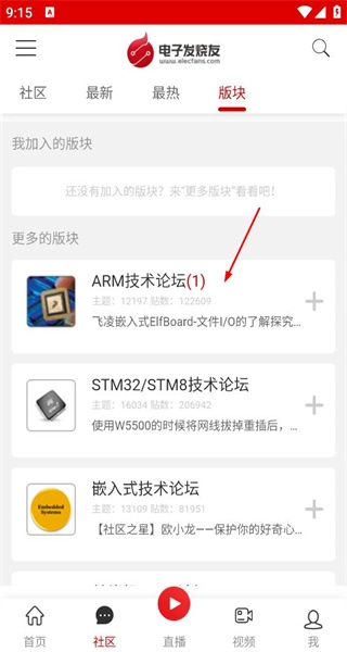 1、打开软件后,进入社区板块页面,看到多个技术论坛板块,选择ARM技术论坛进入详情页。