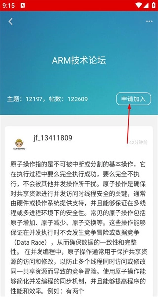 2、进入ARM技术论坛详情页,查看主题数帖数,点击页面上的申请加入按钮,推进加入流程。
