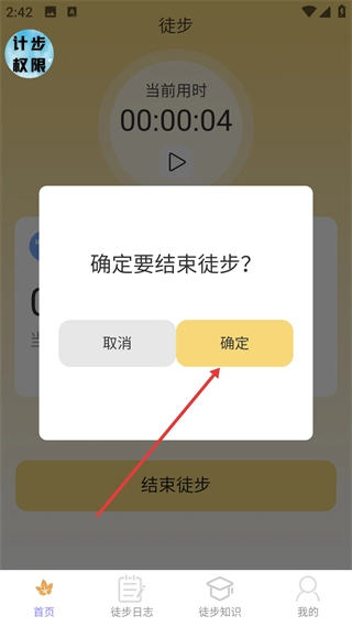4、点击【结束徒步】后,会弹出【确定要结束徒步?】的确认框,点击【确定】即可完成本次徒步的收尾操作。