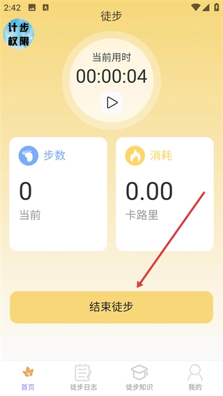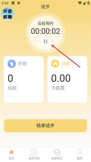 2、徒步过程中,可点击【II】按钮暂停计时,页面会实时显示【当前-步数】与【消耗-卡路里】数据。