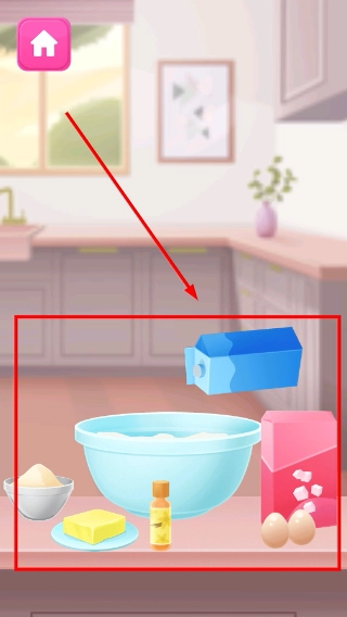 2、在厨房场景中,点击台面的食材(如牛奶、面粉等),将其添加到容器中进行制作。