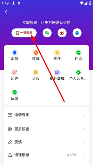 2、进入个人页面后,点击“一键登录”按钮,即可跳转至手机号登录界面。