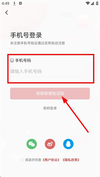 3、进入手机号登录页面后,填写手机号码,接着点击获取短信验证码的按钮。