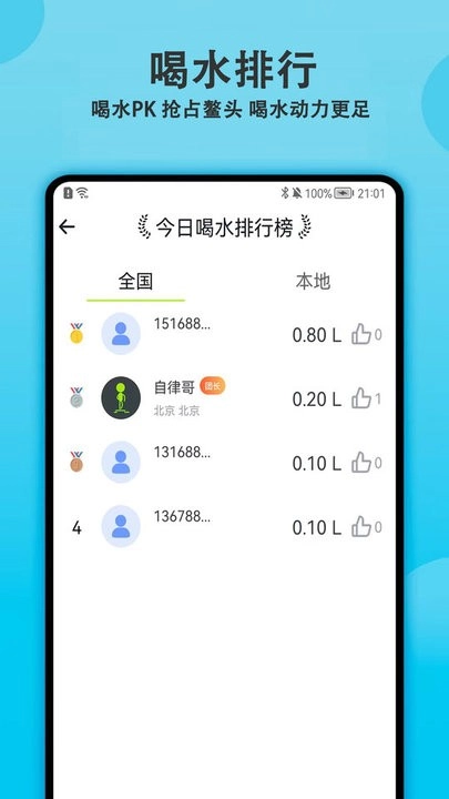 还可以与全国各地的用户进行喝水PK,让用户清楚知道自己的喝水排行;