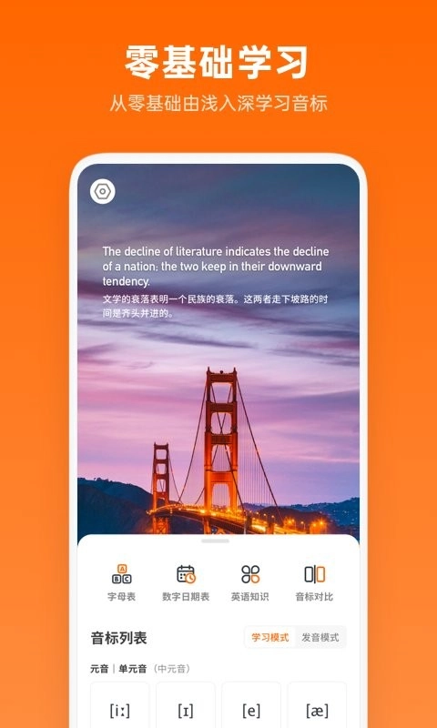 扎实的音标功底是学好英语的关键,通过48个英语音标的发音技巧;图文并茂的方式让用户从零基础由浅入深学习音标,并通过发音练习,加深英语的自然拼读。