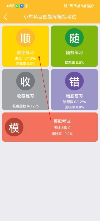 2、在功能列表中选择科目四题库模拟考试选项,进入科目四练习的功能选择页面。