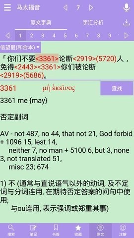 1、收藏:将句子、章节等内容放入收藏夹;2、原文:用户可以学习英文圣经原文;3、注意:分析并标记难句的来源;4、主题:系统随机给出知识点对应的主题。
