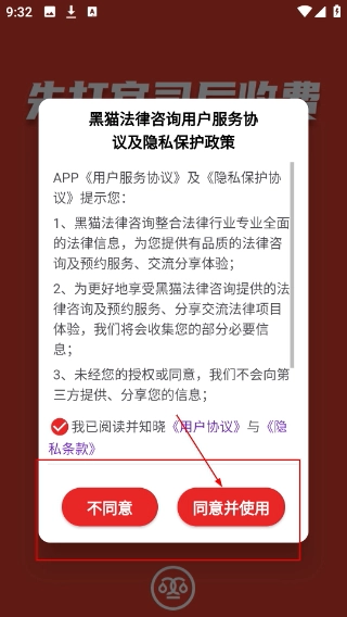 1、在【黑猫法律咨询用户服务协议及隐私保护政策】界面,点击【同意并使用】进入软件功能板块。