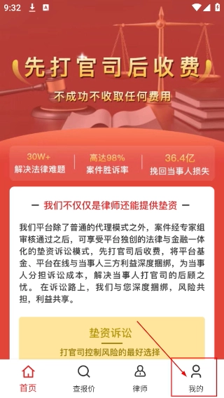 2、进入界面后,了解【先打官司后收费】-不成功不收任何费用的模式,点击底部【我的】,可使用【垫资诉讼】等法律服务。
