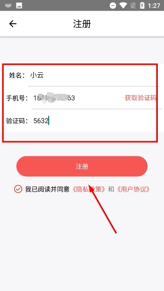 4、在注册页面,填写姓名、手机号,获取并输入验证码,勾选协议后点击【注册】完成账号创建。