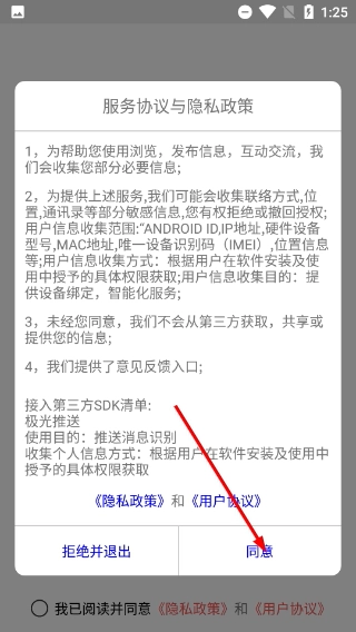 1、在【服务协议与隐私政策】弹窗中,阅读相关条款后,点击【同意】按钮以继续使用应用功能。