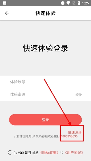 3、在快速体验登录页,若无需体验账号,点击【快速注册】按钮可进入注册流程界面。
