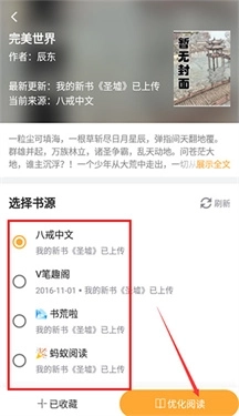 2、找到自己喜欢的阅读小说后,可以选择书源,也可以点击优化阅读;