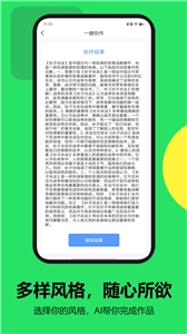 文章生成器极速版是一款可免费使用的手机AI写作软件,用户只需输入关键词和需求描述,就能借助AI持续生成文章内容。软件多种文体与文风供选择,助力用户轻松完成创作,快速产出高质量文章。其不仅重复率低,还配备智能算法和纠错系统,为用户提供优质内容支持。感兴趣的朋友不妨前往12365网体验文章生成器极速版!