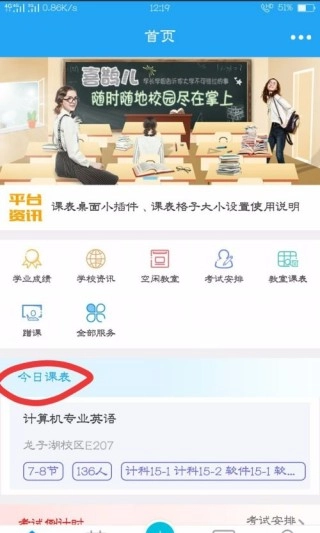 2、登录之后,我们在首页就能看到当前课表的显示。