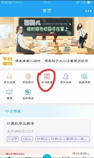 5、有时候我们想找个地方上自习、巩固知识,这时候点击首页的“空闲教室”选项就可以了。