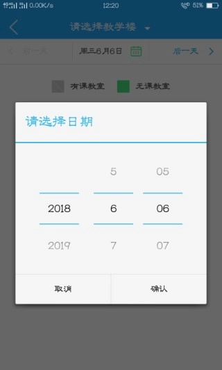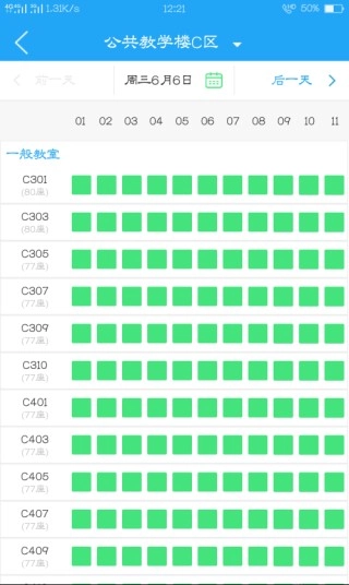 7、也可以点击选择教学楼,挑选一个让自己感到舒心的环境,系统就会显示出该教学楼内的教室;其中,有课程安排的教室会呈现灰色,处于空闲状态的教室则会显示为绿色。