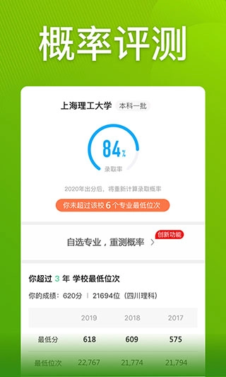 录取概率评测、志愿风险评估、可报考院校、依分数择专业、专业数据对比等极具实用性的功能,帮你迅速确定目标大学与专业。