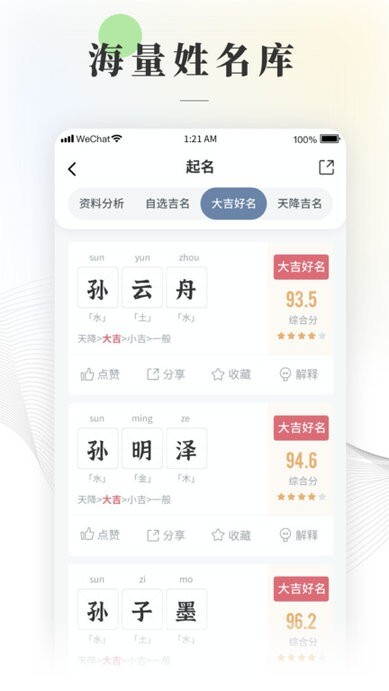 3. 操作方便快捷,省去了传统流程的繁琐步骤。只需打开手机,选择所需的取名或解名功能,再按照软件提示录入相关信息即可,全程无需专业人士指导,中老年人也能轻松上手,一键就能完成取名或解名操作。