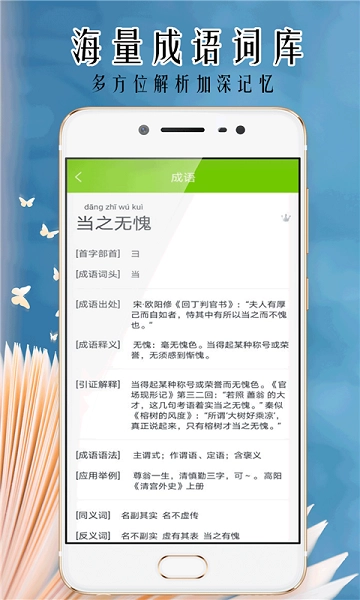 3、支持一键搜索成语,可呈现其来源、详细解释以及反义词和近义词列表。