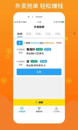 3、配送员可依据自身当前位置与订单的距离远近,以及订单能带来的收益情况,来决定是否抢单。