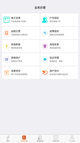 用电客户在绑定用电户号后,能够办理多种用电业务,比如用电新装、用电变更、用电销户、故障报修以及办理进度查询;同时还具备用电信息查询功能,涵盖电价信息查询、电费账单查询、缴费记录查询、当前欠费信息查询,此外还有用电缴费的功能。