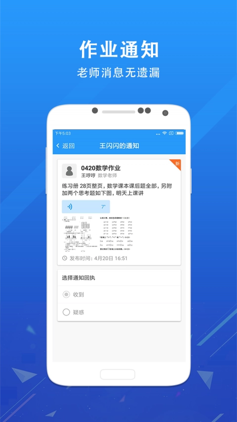 可以查看老师发布的校园通知与学习任务,还能提交通知回执以及多种格式的作业。