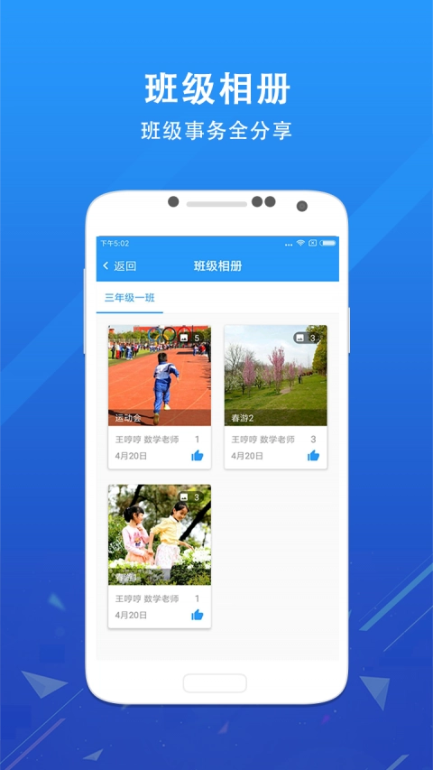 -班级相册:查看老师发布的班级相册,点赞互动;