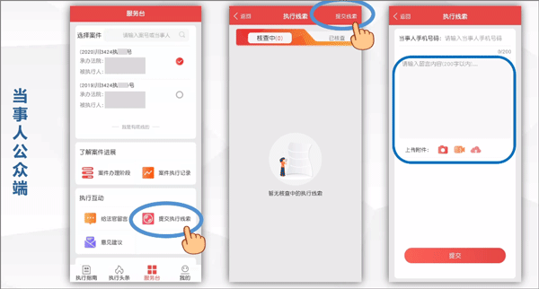 2、服务台功能支持您随时随地查看案件进展,还能向法官留言或提交执行线索。