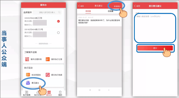 4、进入互动模块后点击【提交意见建议】,选择需提交意见建议对应的案件。点击右上角的【新增建议】,输入拟提交的意见建议内容,点击提交按钮完成操作。提交后可等待法官回复,您也可以随时查看法官的回复内容。