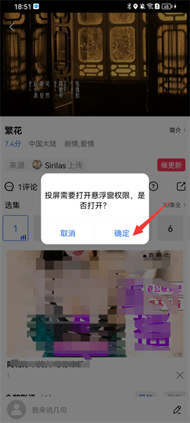 3、请注意,投屏功能需要开启悬浮窗权限,我们只需点击确定就能完成这一步操作。