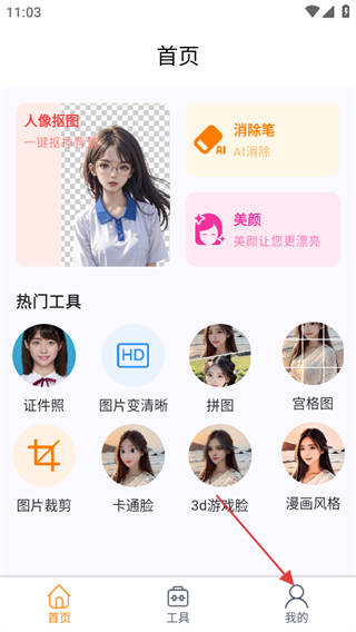在美颜修图的首页,点击页面右下角的“我的”选项,就能进入个人相关页面。