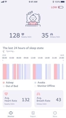 当宝宝出现呼吸过速/过慢或心率过速/过慢等情况时,App也会相应提示,让您及时了解宝宝的异常情况。并且为您提供宝宝每天的睡眠解析报告,经过长期记录,让您更了解宝宝的睡眠习惯及睡眠健康情况。
