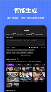 AI画图是一款可免费使用的手机AI绘画应用,兼容多种绘画风格与创作方式,具备简洁友好的操作界面和专业的AI绘画能力,即便没有绘画基础,也能通过AI生成自己心仪的画作。它支持输入各类关键词,只要描述你的绘画需求,就能为你打造出理想的作品,且所有功能均免费开放,欢迎大家前来体验AI画图!