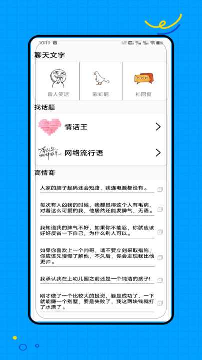 2、除此之外,还会教大家当下网络上的流行用语,以及如何说情话之类的聊天技巧,并且支持一键复制粘贴内容,方便用户轻松和朋友聊天!