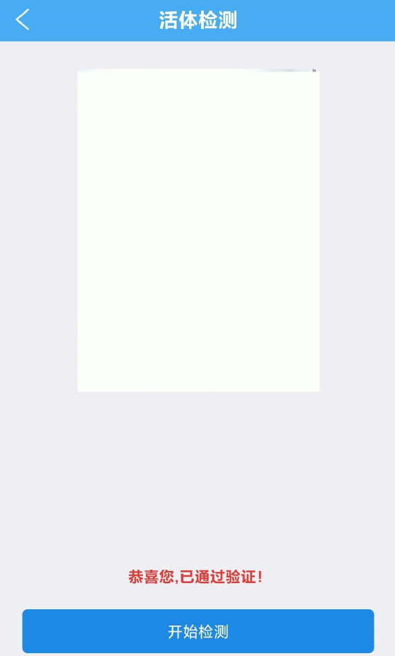 4、点击“开始检测”按钮,将面部对准手机屏幕上出现的圆圈,软件随即启动人脸比对流程。若比对成功,屏幕下方将显示“恭喜您,已通过验证”的提示。