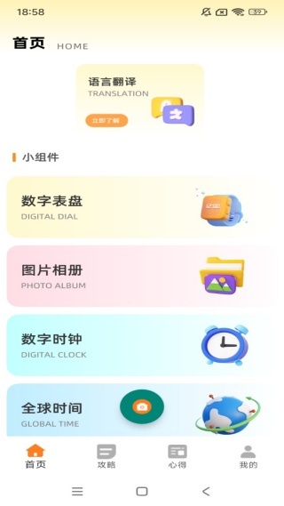首页推送的资料十分丰富,不仅支持语言翻译功能,还能进行数字表盘设置、图片相册管理等操作。