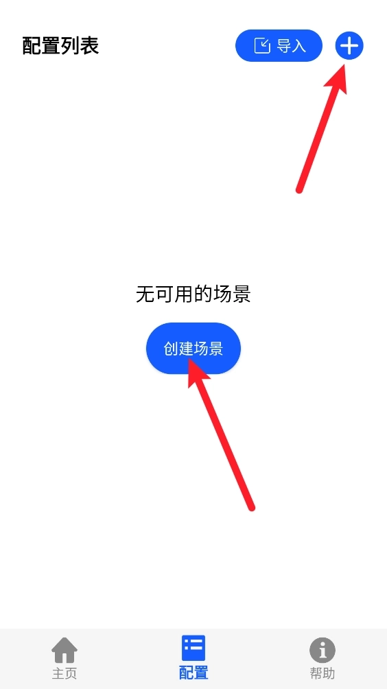 3、如图所示,在配置页面中,可点击右上角的“+”号按钮,也可以选择点击“创建场景”按钮来进行操作。