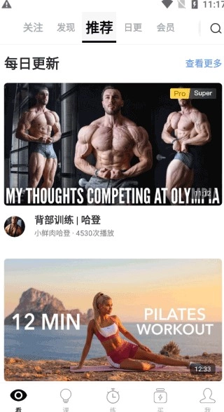 2、借助功能栏中的“观看”板块,查看近期更新的各类健身视频。