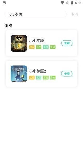 4、以“小小梦魇2”这款游戏为例,在搜索结果页面找到对应的游戏条目后,点击其右侧的“查看”按钮