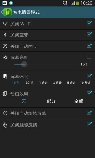 1、自定义省电情景模式:关闭Wi-Fi/蓝牙/自动同步/动画效果/自动旋转屏幕/触感反馈、调整屏幕亮度、调整屏幕休眠超时;