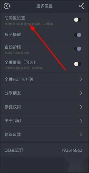 3、进入高级设置页面后,用户能够对应用稳定性(防闪退)、用眼健康提醒(疲劳提示)、智能护眼触发以及全屏模式等功能进行配置,所有已做的设置会在退出该界面时自动完成保存。
